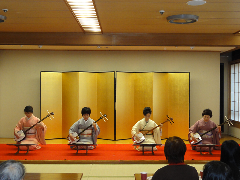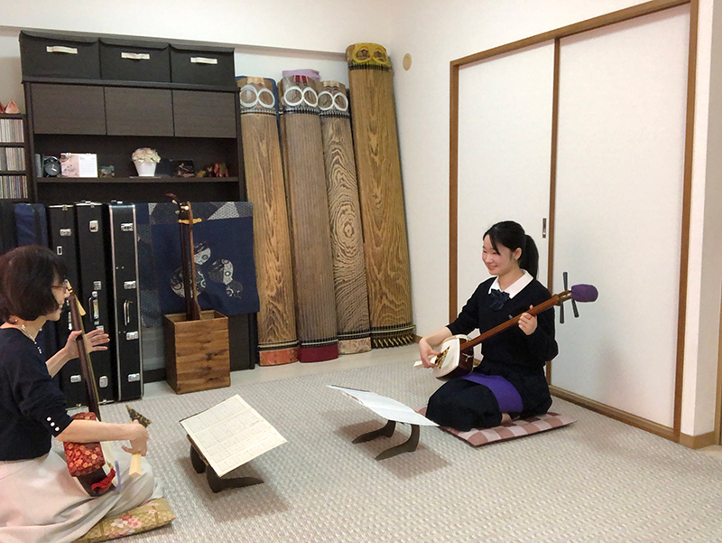 箏のほか、地唄三絃のレッスンも行っています。三味線音楽には、様々なジャンルがありますが、基本的に箏と結びついて演奏する三味線ジャンルを地唄三絃といいます。当教室では、九州系地唄三絃の指導を行っています。指導者はNHK育成会を三絃で卒業。三絃指導にも力を入れています。発表会等では、箏・尺八との合奏「三曲合奏」も経験できます。生徒さんの中には三絃でNHK邦楽オーディションに合格された方もいます。